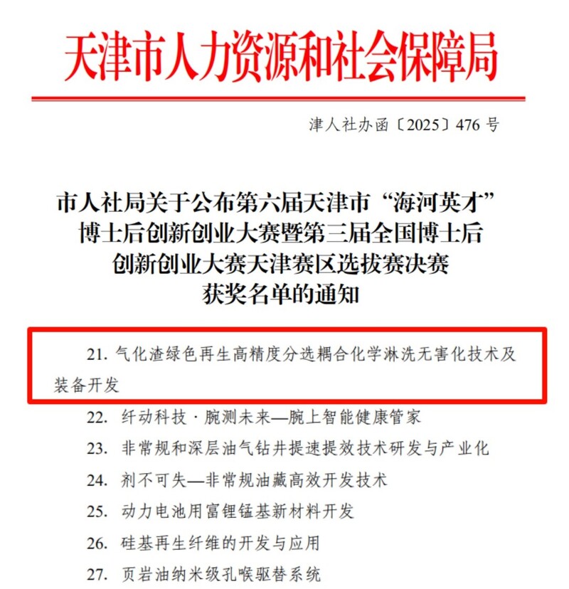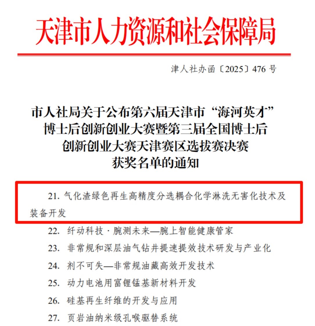 此次大赛吸引3000余名高层次人才参与,申报创新赛项目307个,236个项目通过预赛、晋级决赛,77个优质项目角逐最后的奖项。中煤天津设计公司“气化渣绿色再生高精度分选耦合化学淋洗无害化技术及装备开发”项目最终取得新能源与节能环保赛道天津赛区决赛优胜奖。