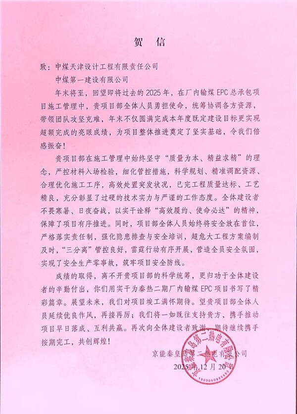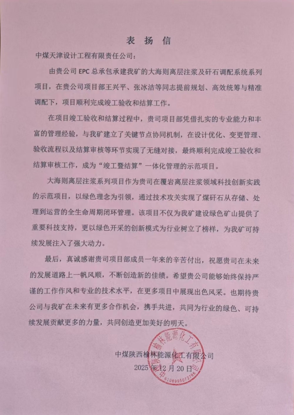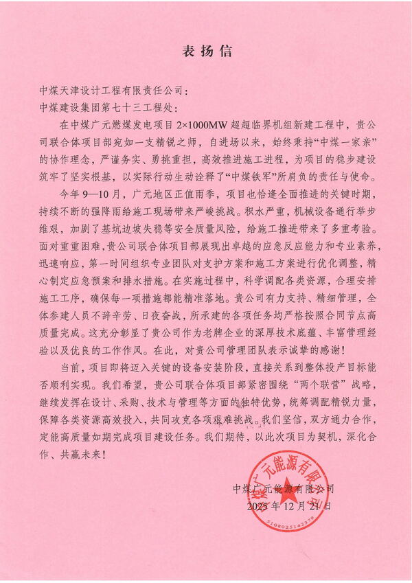 近日,公司连续收到4封业主单位发来的表扬信,对以下四个重点项目的优异表现给予充分肯定。其中,广元输煤卸煤、秦热二期2个电厂项目精准发力、高效推进,高质量完成年度施工节点任务;大海则离层注浆、里必瓦斯电厂2个项目严把质量、严控标准,顺利通过竣工(联合)验收。这些成绩的取得,既是对公司专业技术实力、高效履约能力和优质服务水平的高度肯定,也为公司第二次党代会的胜利召开献上了一份厚礼。