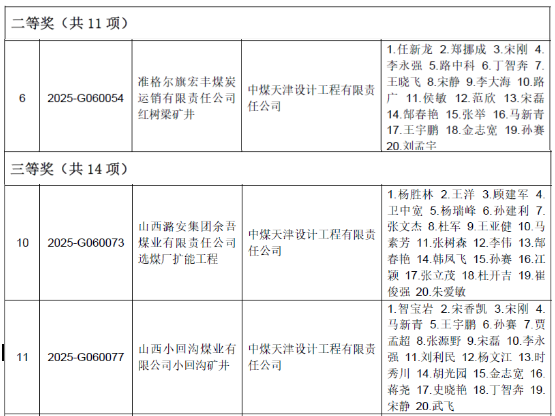 近日,中国勘察设计协会公布2025年度全国优秀工程勘察设计奖获奖名单,中煤天津设计公司3个项目获奖,其中:《准格尔旗宏丰煤炭运销有限责任公司红树梁矿井》荣获二等奖,《山西潞安集团余吾煤业有限责任公司选煤厂扩能工程》、《山西小回沟煤业有限公司小回沟矿井》荣获三等奖。