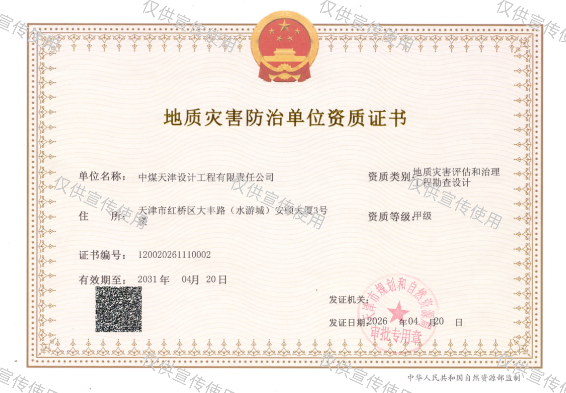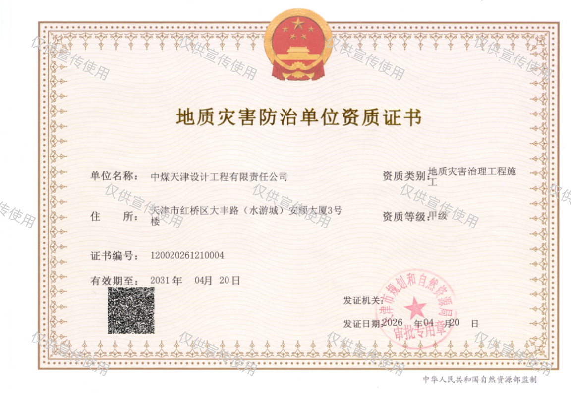 近日,中煤天津设计公司取得地质灾害评估和治理工程勘查设计、地质灾害治理工程施工2项甲级资质。